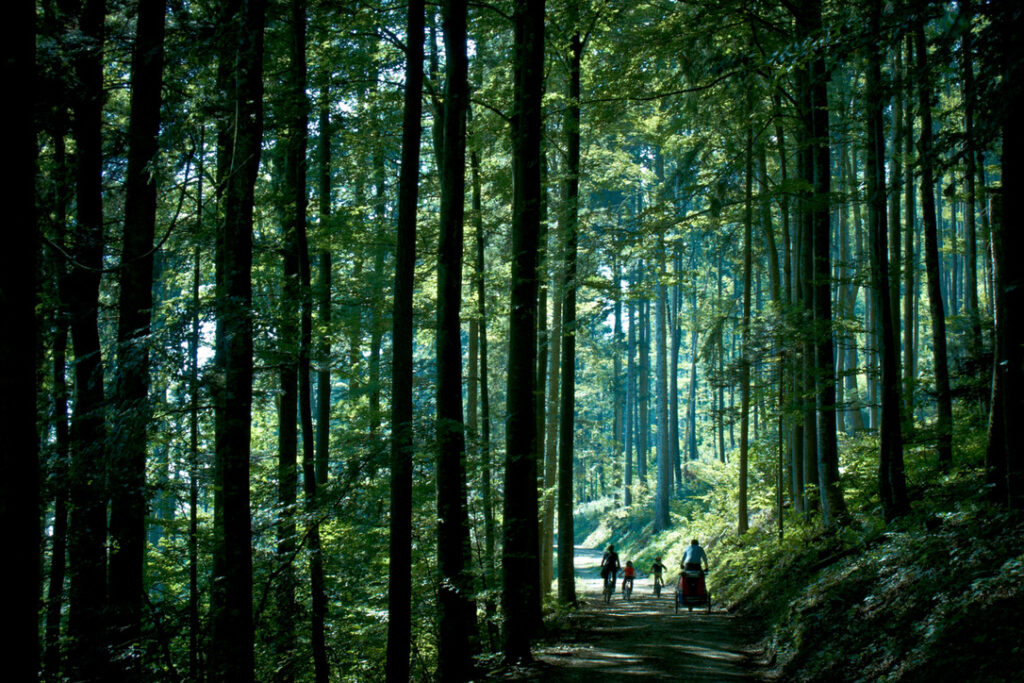 Familie mit Kindern auf einem Fahrrad Ausflug im Wald. Famille avec des enfants sur un voyage a velo dans les bois. Family with children on a bicycle trip in the woods.